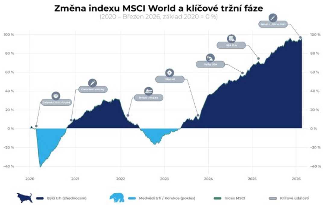 Navzdory všem těmto globálním šokům vzrostl index MSCI World od začátku roku 2020 do března 2026 zhruba o 85 %. Právě uplynulé roky znovu ukázaly, že globální akciové trhy mají mimořádnou schopnost přizpůsobit se i velmi silným otřesům a navzdory nim si dlouhodobě zachovat růstovou tendenci.